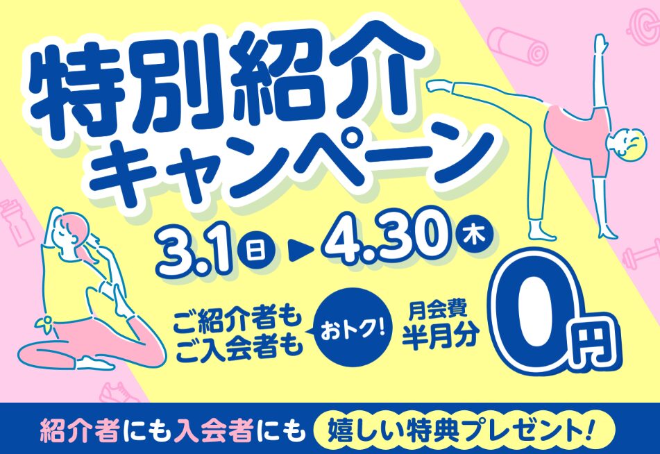| 2025年4月1日〜30日 | 登録手数料0円 3ヶ月目月会費50%OFF 施設利用無料券1枚プレゼント パーソナルトレーニング・もみほぐし&ストレッチ2回分0円 はじめてサポート0円 CS Live@HOME無料視聴コードプレゼント |